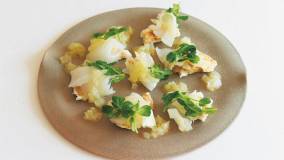 魚を骨ごとカラッと揚げ、のりのスープにのせました。骨付きなのでボリュームが出るうえ、じっくり揚げているのでそのまま食べられます。