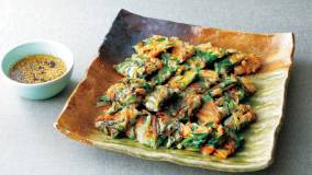 つくだ煮でおなじみのすじえびを、親しみやすい料理にアレンジ。すじえびのうまみを生地に生かし、たっぷりの春野菜と合わせて栄養満点の一品にしました。甘酢っぱいたれがチヂミの味を引き締めます。