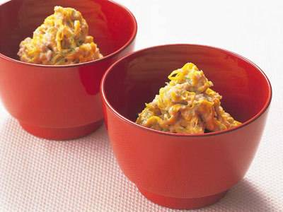 きのこはみりんとおしょうゆで甘辛く、長芋はお塩を少々加えただけのあっさり味です。さまざまなきのこの持ち味を長芋がトロリとやさしくまとめてくれます。おもてなしにも。