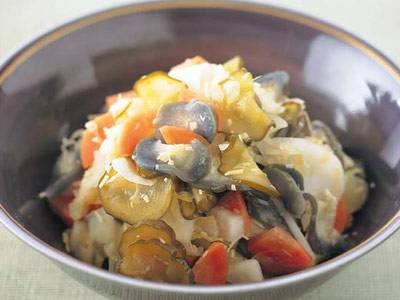 昆布のうまみと香りをつけた甘エビをたっぷりの野菜や海藻といっしょに、からし酢でいただきましょう。