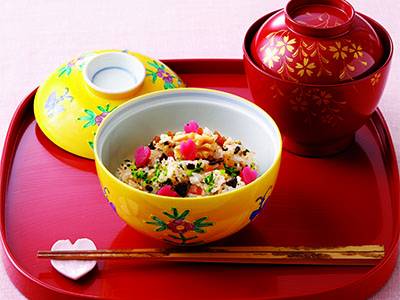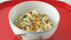 “ほろほろご飯”は、岩手の南部地方から秋田のあたりにかけての郷土料理といわれている混ぜご飯。“うこぎ”というほろ苦い山菜の代わりに春菊を使います。細かくして加えたくるみの食感もアクセントに。