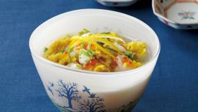 上品なうまみのすずきを使用し、椀(わん)づまに春雨と白うり、しいたけ、吸い口は青柚子ですっきりと仕上げました。