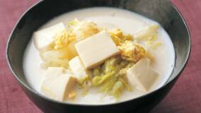豆腐と豆乳のダブル使いにかきたまをプラスした、やさしい味わいの汁物。すりおろしたしょうがの効果で、体も温まります。