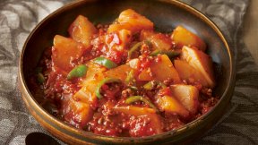 大根に甘酸っぱいトマトの組み合わせが新鮮!うまみ、甘み、酸味のバランスが絶妙な一品です。大根はしっかり煮込んで、とろけるような柔らかさに。ピーマンのかわりに刻んだ大根の葉を加えても。