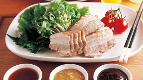 厚切り肉のソテーと、トマトソースの相性は抜群。ソースの隠し味にしょうゆを加えるのがポイントです。