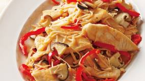 にんにくととうがらし風味のシンプルな炒め物。むね肉をジューシーに仕上げるには、水分を加えて蒸し炒めにするのがコツです。