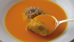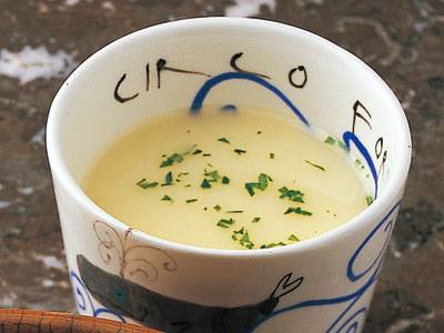 「蒸らし炒め」で材料のうまみを引き出したポタージュ。米でとろみをつけ、幼児から老人まで食べやすくしてあります。