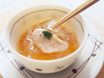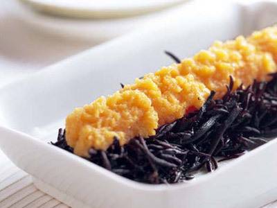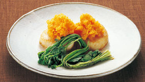 鶏肉は皮を焼いて香ばしさを出してから、酒蒸しにします。その蒸し汁であえたひじきの上に並べ、レモンの酸味も爽やかなにんじんソースをかけます。まずは目で楽しみ、全体を混ぜていただきましょう。