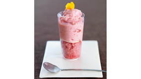 いちごの甘酸っぱいスムージーと、柚子とスパイスが香るグラニテの2層仕立てが目にも鮮やかです。混ぜながらいただくと、2つの味と異なる食感がバランスよく溶け合い、おいしいですよ!