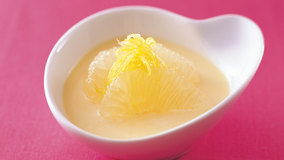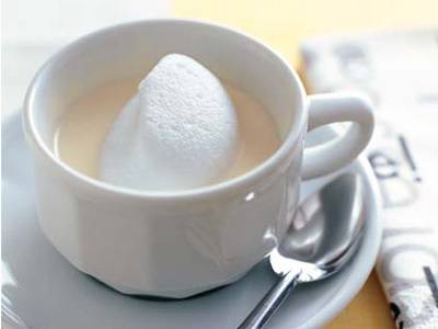 アーモンドではなくコーヒー豆で香りをつけたブランマンジェ。カプチーノのように泡立てたミルクをのせて仕上げます。