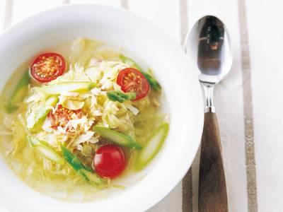 春キャベツを外葉から軸や芯まで一緒に煮た、シンプルなスープ煮です。鶏だんごのうまみが詰まった煮汁ごと楽しんで。