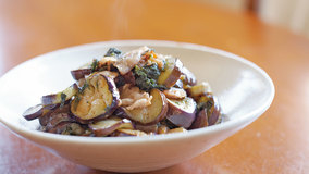 「なすが1人1コでは物足りない」という飛田さんのなすたっぷり煮物をご紹介。鶏だんごのうまみを吸っておいしくなるので、多めにつくりましょう。