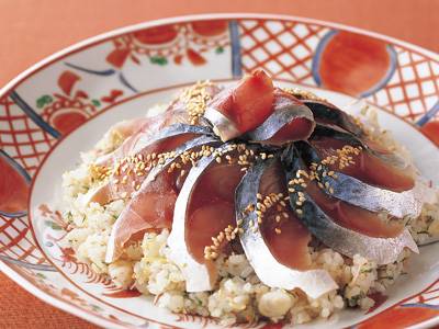 しめさばのしめ加減がポイント。すし飯に香りのある野菜を加えて、さっぱりと。