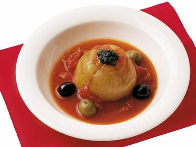 たまねぎを丸ごとコトコト煮て甘みを引き出します。トマトスープにオリーブとバジルソースがきいた一品です。