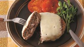 肉ダネはにんにくとパセリで風味を効かせたパンチのある塩味。両面をこんがり焼いたらふたをして中まで火を通します。