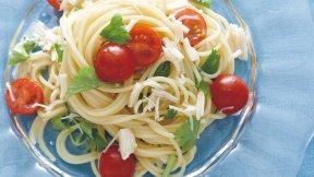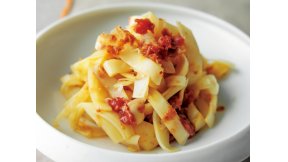 残暑疲れを吹き飛ばす、おかずサラダ風のあえ物です。野菜は下処理で口当たりをよくし、カリカリのにんにくも具としてたっぷりと。