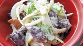 「鶏レバーの赤ワイン煮」をサラダ風にアレンジします。レバーに香りよい野菜とマヨネーズのまろやかさがよく合います。