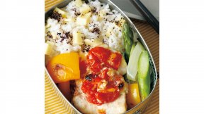 チーズが表面をコーティングするので、時間がたってもジューシーなハンバーグのお弁当。トマトケチャップ&ソースで手軽に洋食風の味わいになります。