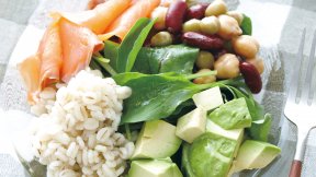 鶏ひき肉でつくる塩味ベースのつくねをメインにした、さっぱり&ヘルシーなお弁当です。たっぷりのえのきだけを加えたつくねは、冷めても柔らか。カラフルなサラダで彩りと食感の変化を楽しみます。