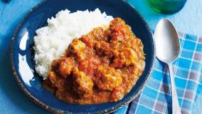 節約おかずの味方、豚こまでトローリ、こっくりしたハヤシライスが簡単にできます!季節の青菜を混ぜたバターライスを添えて。