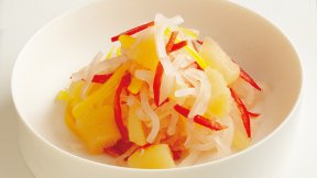 子孫繁栄を願う数の子はおせちの常連。ただしコレステロールが高めなので、メタボ予防に役立つ酢でマリネにしましょう。緑黄色野菜のパプリカや食物繊維豊富な大根を合わせればボリュームや歯ごたえも出て、少量でも満足で華やかな一品に仕上がります。