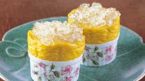 冷たいかぼちゃのスフレをココット型からふくらんだように仕上げました。クラッシュゼリーをあしらうと、キラキラ輝く宝石のよう。