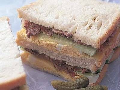 柔らかく煮た牛すね肉をサンドした食べごたえのある一品です。パンにぬったからしマヨネーズが食欲をそそりますよ。