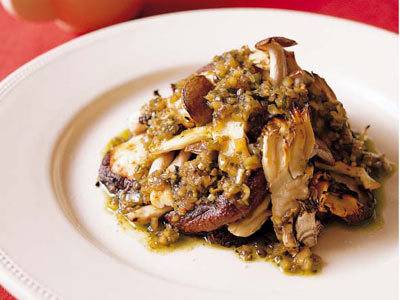 好みのきのこを何種類でも組み合わせ、網でこんがり焼きます。香りのよいソースといっしょにどうぞ。