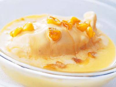 「とうもろこしの冷たいスープ」がデザートに変身!メープルシロップのやさしい甘みがとても合います。
