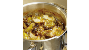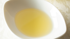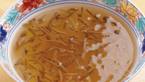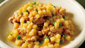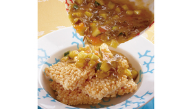 夏らしい、鶏肉入りカレー風味のあんかけです。じゅんさいがいいアクセントになります。おこげにかけたときの、ジャーッという音も一緒に召し上がれ。