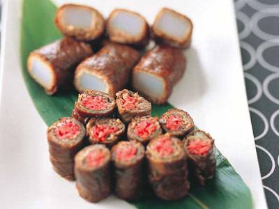 切り口が紅白でキレイな牛肉巻き。こんにゃくの触感が牛肉とよく合います。火を通しすぎて肉を固くしないように。