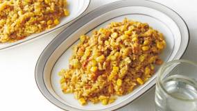 炊飯器で炊き込んでつくる具だくさんのピラフ。黄色に染まったご飯が食欲をそそります。