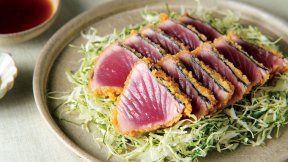 あられの衣で表面はカリッと香ばしく、中はしっとりレアに。あっさりとした初がつおは、少し多めの油で焼き、戻りがつおに負けない極上の口当たりに仕上げます。かつおのかわりにサーモンやまぐろでつくっても。