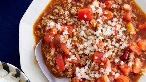 トマトとひき肉のうまみが重なり合い、豆腐に負けないおいしさに!仕上げの生たまねぎで香りと食感をプラスします。