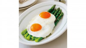 アスパラガスのおいしさは、ゆで方次第。根元と皮を加えた湯でゆでると、味が濃厚に。卵は水分の多い水溶性卵白を除くとプリッとした食感に。焼くときは弱火で、塩は白身にだけふりましょう。おいしく、きれいな目玉焼きがつくれますよ!