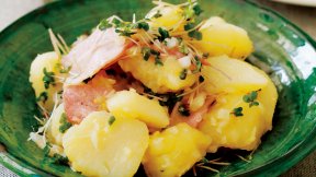 じゃがいもは砂糖と塩を加えた湯でゆでてしっとりと。温かいうちにつぶして、ドレッシングであえれば、味がしっかりとつきます。食べる温度帯は、「ほの温かい」くらい。パサつかず、最後までおいしく食べられます。