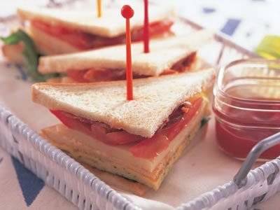 オムレツ、ベーコン、チーズなどをたっぷりはさんだサンドイッチ。ボリュームたっぷりです。