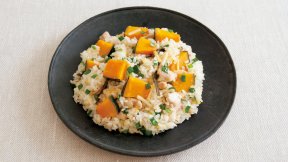 フライパンで手軽につくれるパエリヤに、栄養満点なかぼちゃとにらをたっぷりと。しょうがと昆布だしのいい香りに食欲がそそられます。アツアツをどうぞ!