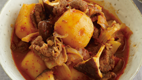 骨付き豚肉&じゃがいもを甘辛く煮た韓国料理「カムジャタン」をヘルシー素材でアレンジします。仕上げに、えごまの葉で香りをつけて。