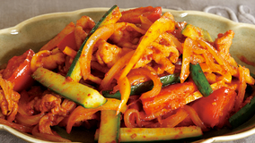 本来は牛肉でつくりますが、こってりとうまみの濃い豚バラ肉でボリュームアップ。肉と野菜にピリ辛の下味をつけて炒めるだけなので簡単にできます。夏野菜をふんだんに使って、バランスよく!