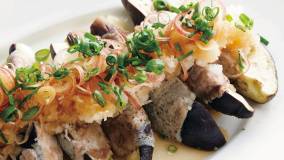 なすを丸ごと蒸して、ふっくらジューシーなおいしさを楽しみます。火を使わず電子レンジで夏仕様のバンバンジーに!