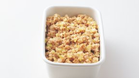 豚こま切れ肉に焼き肉風のあじつけをし、パン粉を混ぜ込んで豚カツの食感を出し、フンワリ焼き上げます。