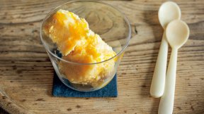 皮がめくれてしまったり煮くずれてしまった「完熟梅のシロップ煮」をつぶして凍らせます。米こうじの甘酒を混ぜるとカチカチに固まらないので、食べやすい。