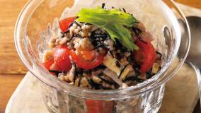 うなぎのかば焼きのようですが、なすです。皮をむいて、下ごしらえは電子レンジで手軽にできます。たれをからめれば、しっかりした味わいでご飯がすすむこと間違いなし。