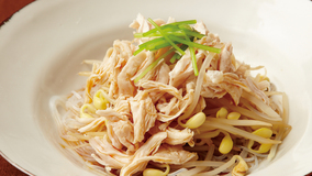 豆もやしと春雨をパスタに見立てた、ノンオイルのさっぱり味です。低カロリーの鶏ささ身で、ボリュームを出すと美味しいですよ。