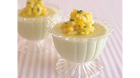 牛乳の代わりに豆乳でヘルシーに仕上げます。寒天とコーンスターチで固めた食感はまるで淡雪のような口溶け。