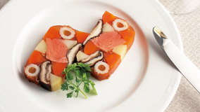 ちくわとゆでた野菜、塩ざけを容器にギュッと詰めてゼリー寄せに。モザイクのような断面がユニークです。節約食材でつくったとは思えないごちそう風の一皿。