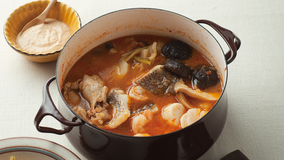 食材それぞれのうまみがたっぷりしみ出した濃厚な味わいです。まずはスープを存分に味わってから、アイオリソースをプラスして味の変化を楽しみましょう!