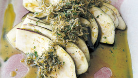 丸ごとのなすを鍋で蒸し焼きにした豪快な一品。なすの水分がハーブの香りとともにたっぷりと口の中に広がります。