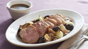 豚肩ロースの塊肉を鍋で焼き上げた、ダイナミックな一品です。ソースはプルーンと紅茶を煮合わせました。